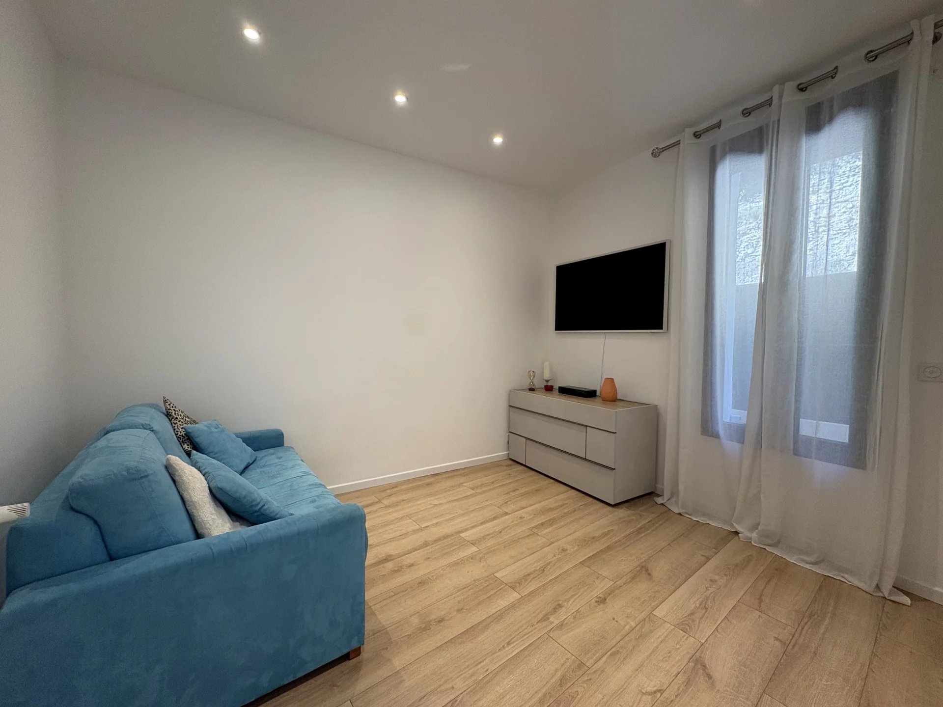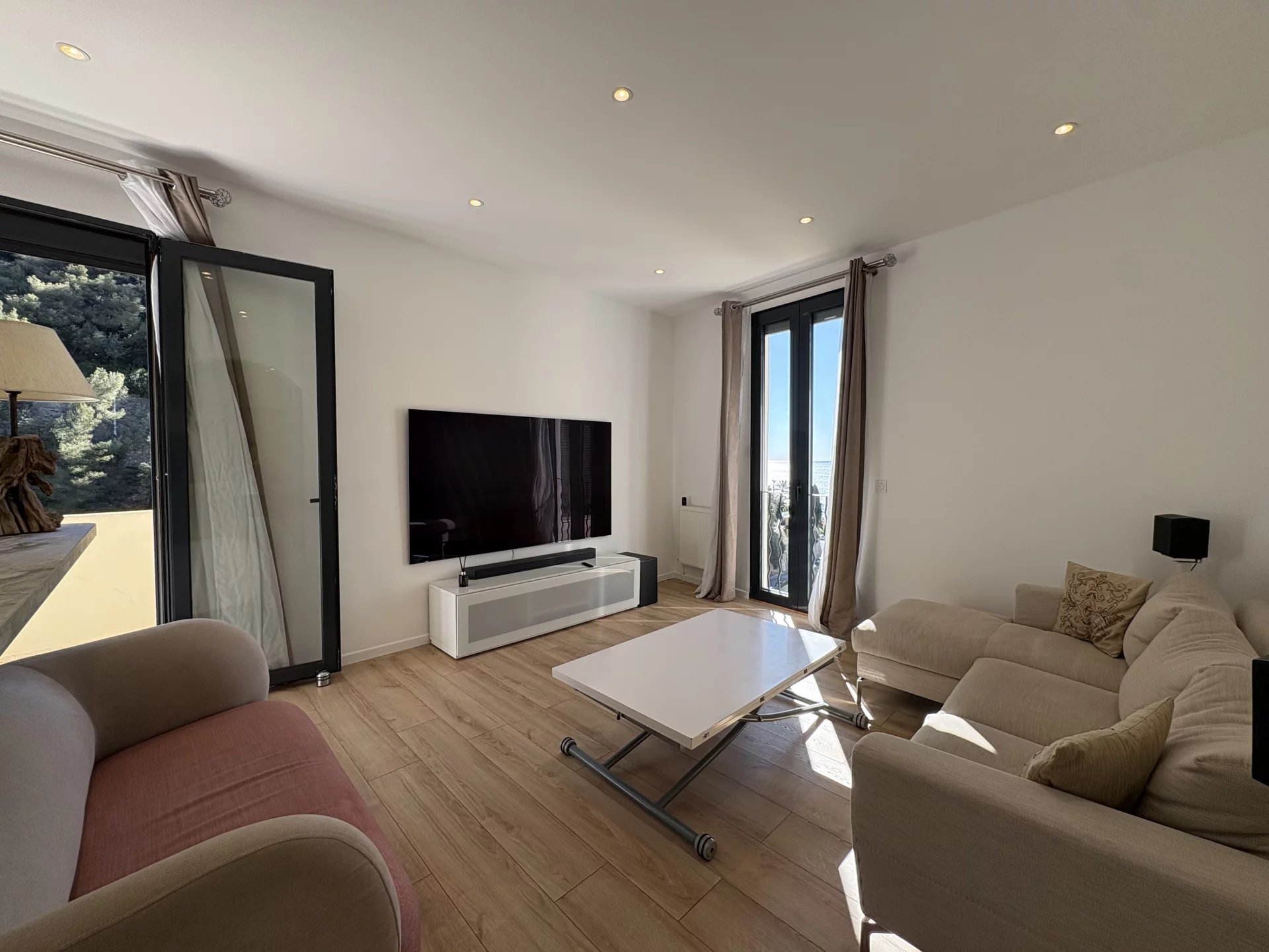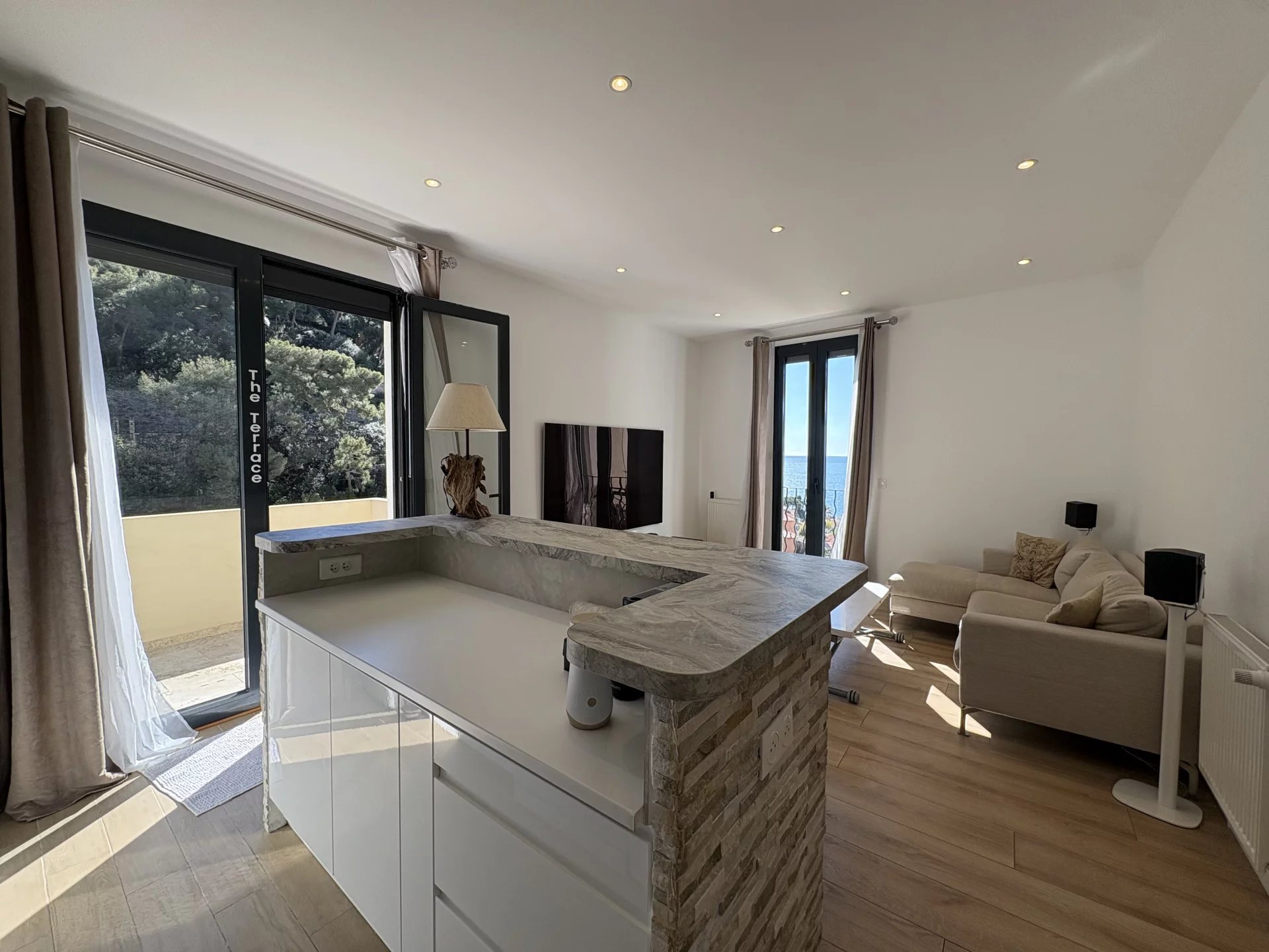 Bathed in natural light thanks to its triple East, South, and West exposure, the apartment stands out for its volumes, warm atmosphere, and open views over the sea and surrounding greenery. The finishes are both modern and refined, including parquet flooring, electric shutters and awnings, a reinforced security door, and a video surveillance system.