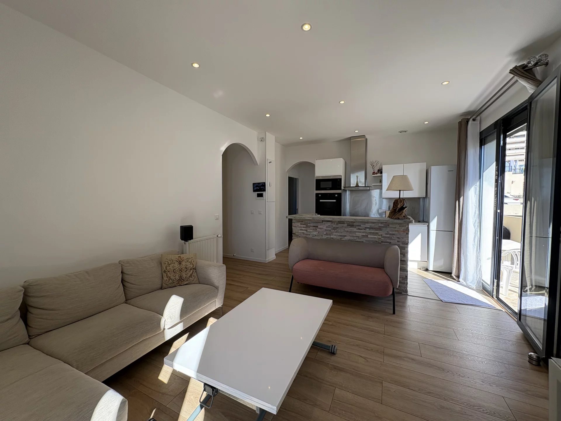 This beautifully renovated 4-room apartment of approximately 62 sqm offers a true “villa on the roof” feel, featuring a private entrance and direct access at the level of the property. It comprises a bright living area with a fully equipped open-plan kitchen, opening onto a pleasant 13 sqm terrace enjoying a stunning sea view. The night area includes two bedrooms, as well as a third room ideal as a child’s bedroom or home office, along with a shower room and separate toilet.